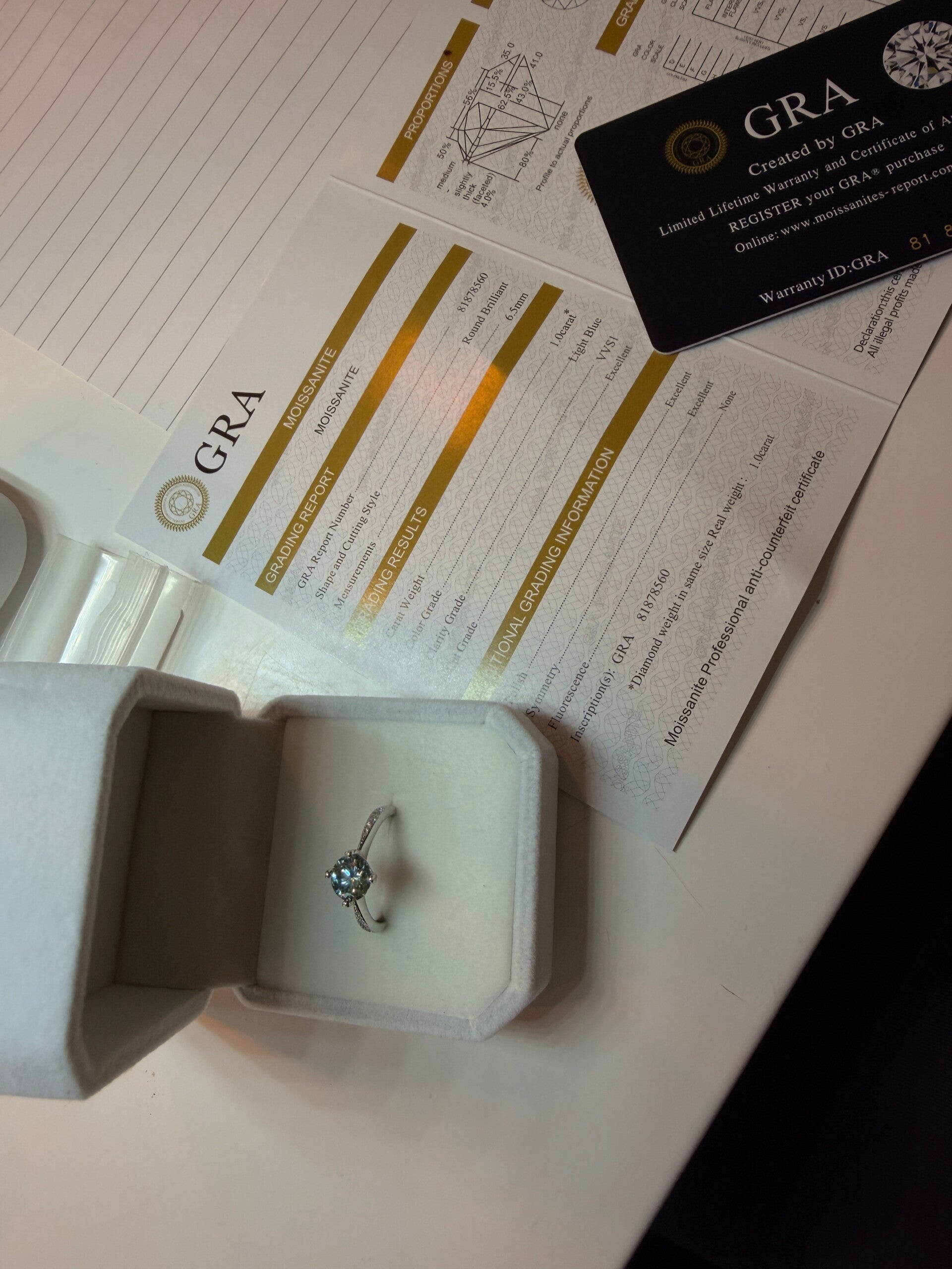Denne vakre ringen er justerbar og er laget av 925 sølv. Steinen er 1 carat lys blå Moissanite. VVS1, round brilliant og excellent cut. Det følger med GRA certificate.