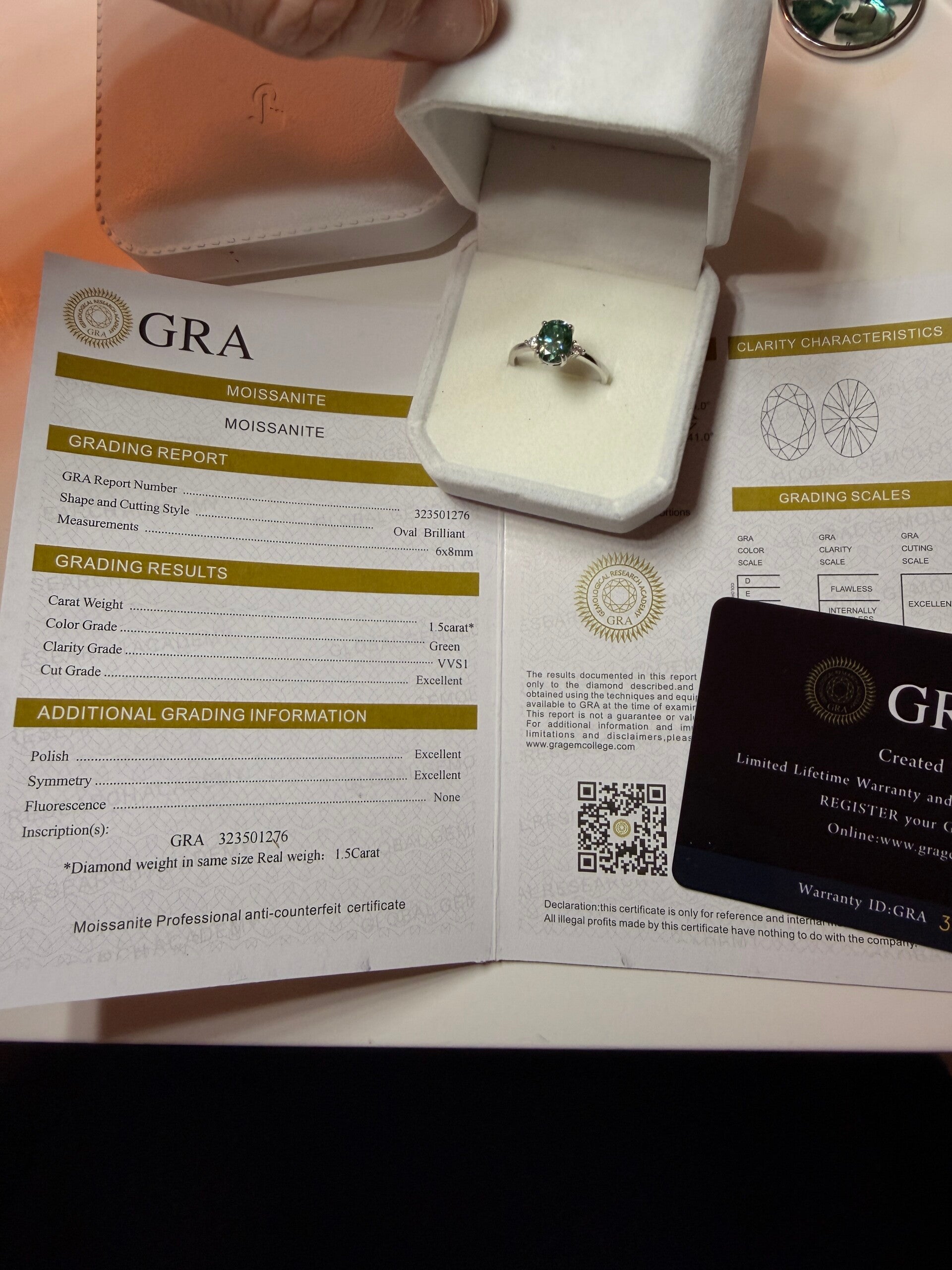 1,5 carat grønn Moissanite ring. Den er VVS1, excellent cut, Oval brilliant, 6x8mm. Ringen er S925 sølv og justerbar. Det medfølger GRA sertifikat.
