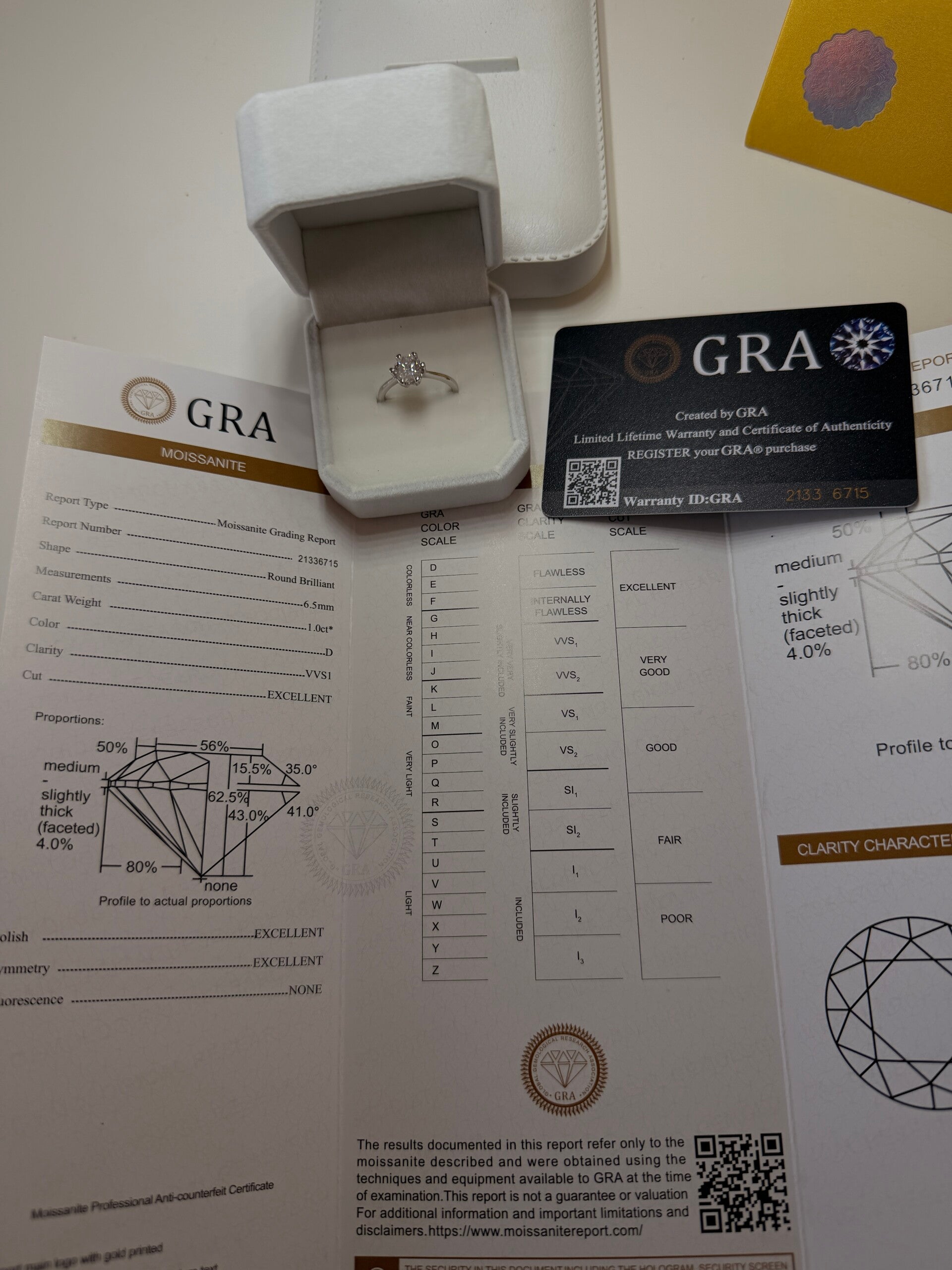 1 ct Moissanite i farge D, VVS1, round brilliant og excellent cut. Steinen er 6,5mm. Det medfølger GRA sertifikat. Ringen er S925 sterlingsølv.