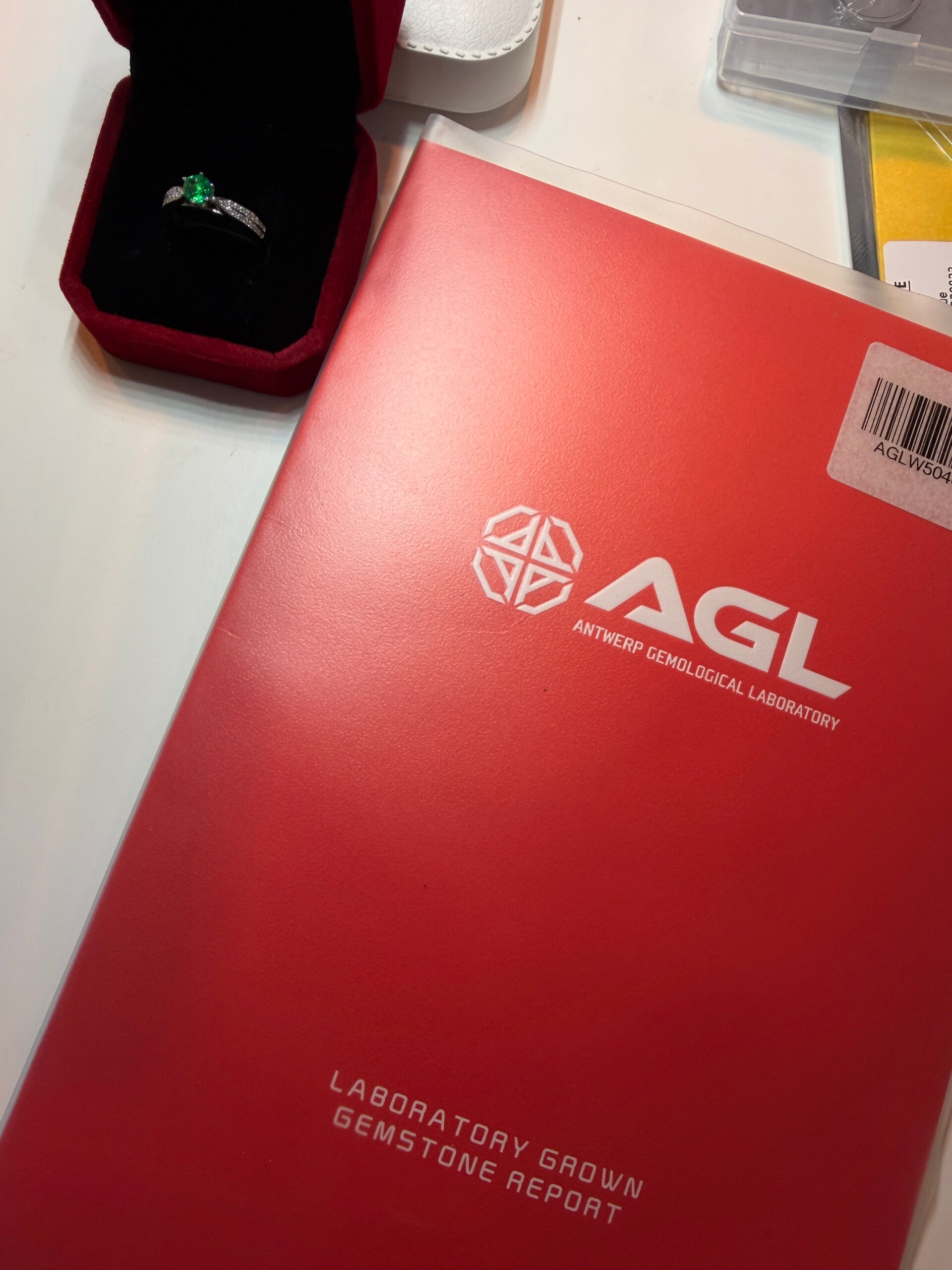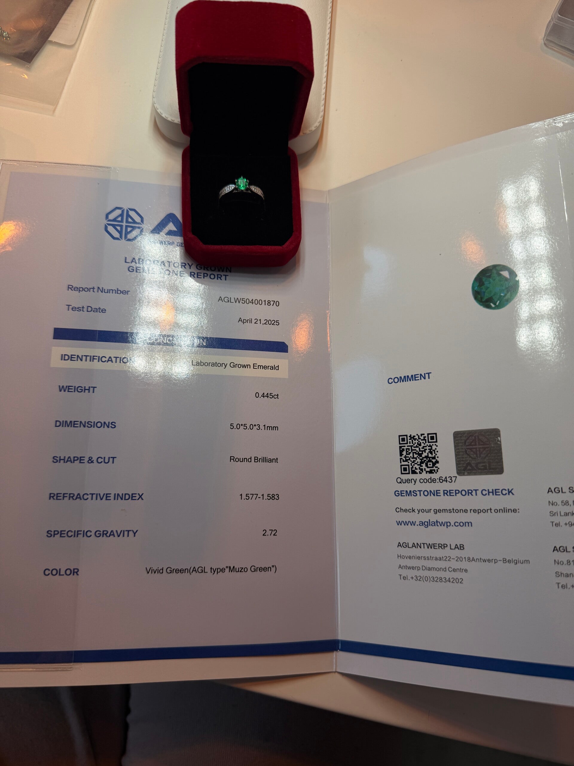 Lab laget emerald 0,445 ct. Steinen er 5mm, round brilliant, vivid green. Ringen er S925 og i størrelse 50,5 EU.AGL sertifikat følger med.