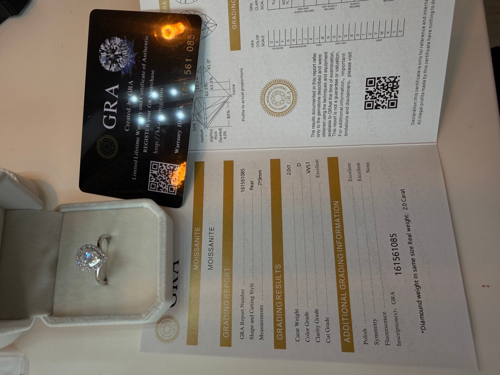 2 ct pear shape Moissanite S925 justerbar ring. Steinen er 7x9mm, farge D, VVS1, excellent cut. Det medfølger GRA sertifikat.