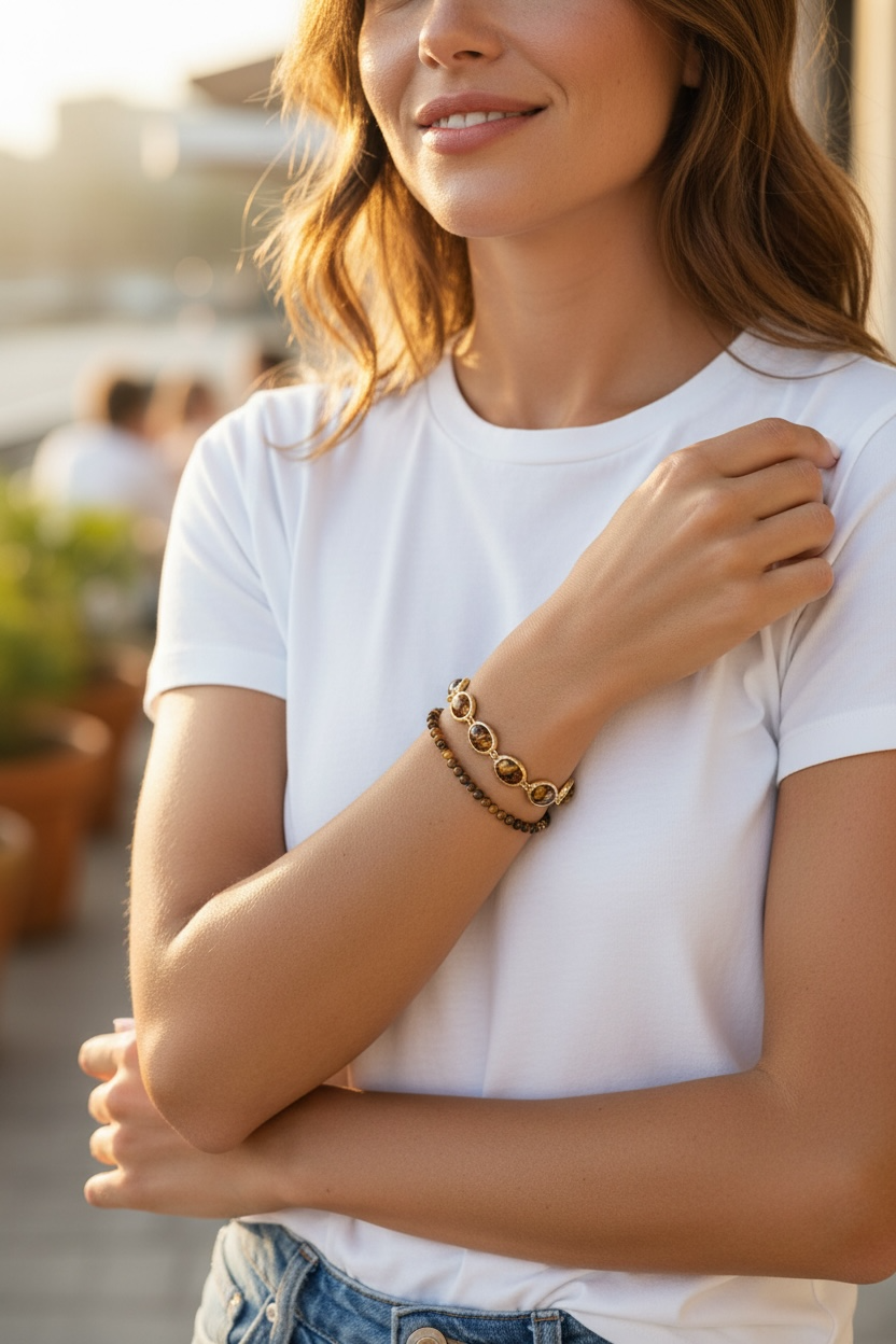 Det antas at en kombinasjon av amber og tigerøye-armbånd gir fordeler som økt selvtillit og kreativitet fra tigerøyet, mens amber gir beskyttelse mot negative følelser og stress. Tigerøyet kan hjelpe med fokus, klarhet og mot, mens amber bidrar til å tiltrekke positiv energi og kan øke følsomheten for gode vibrasjoner. Denne kombinasjonen antas å gi både en følelse av indre styrke og beskyttende jording.