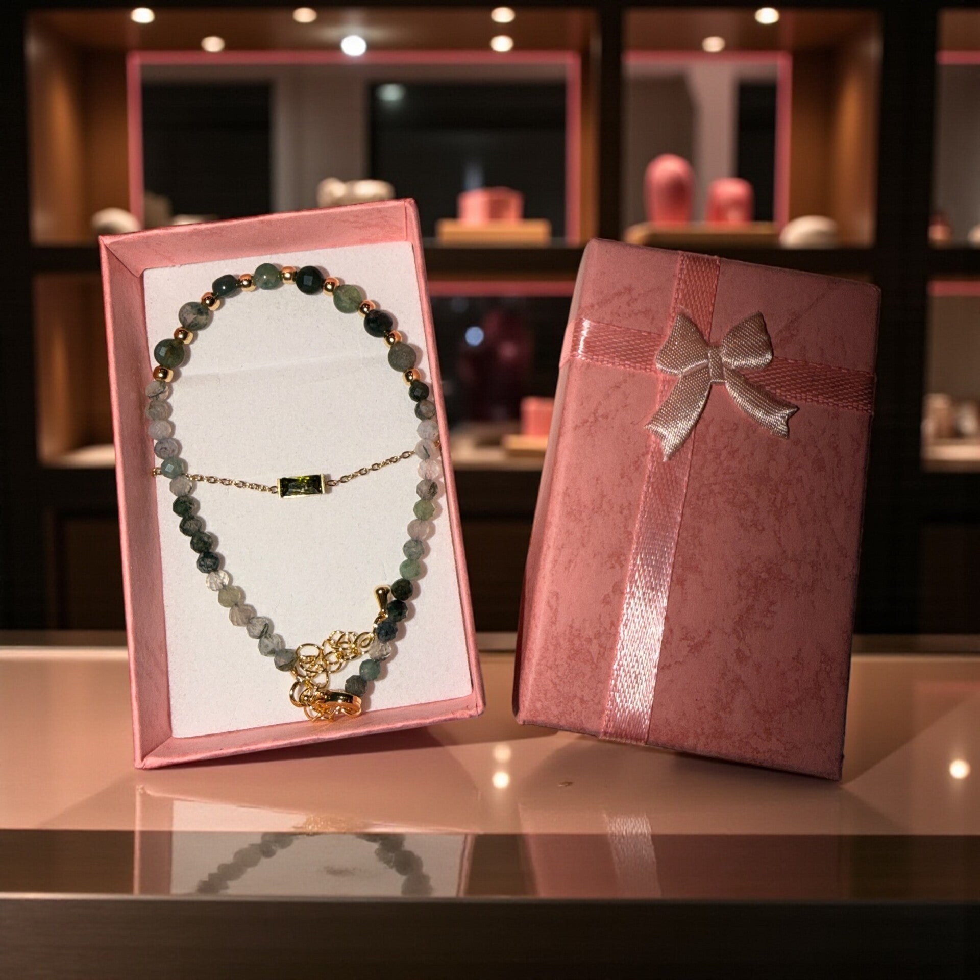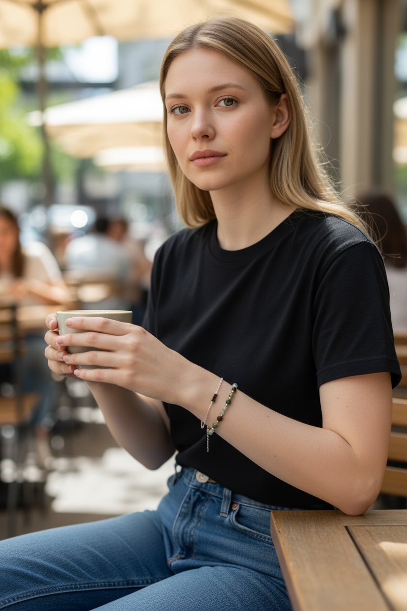 Akvatisk agat er en kraftig jordingsstein som bidrar til å stabilisere følelser, styrke selvtilliten og fjerne negative energier. Den antas også å støtte kommunikasjon, redusere stress og fremme en følelse av ro. Den andre armbåndet har en grønn zirkon stein.