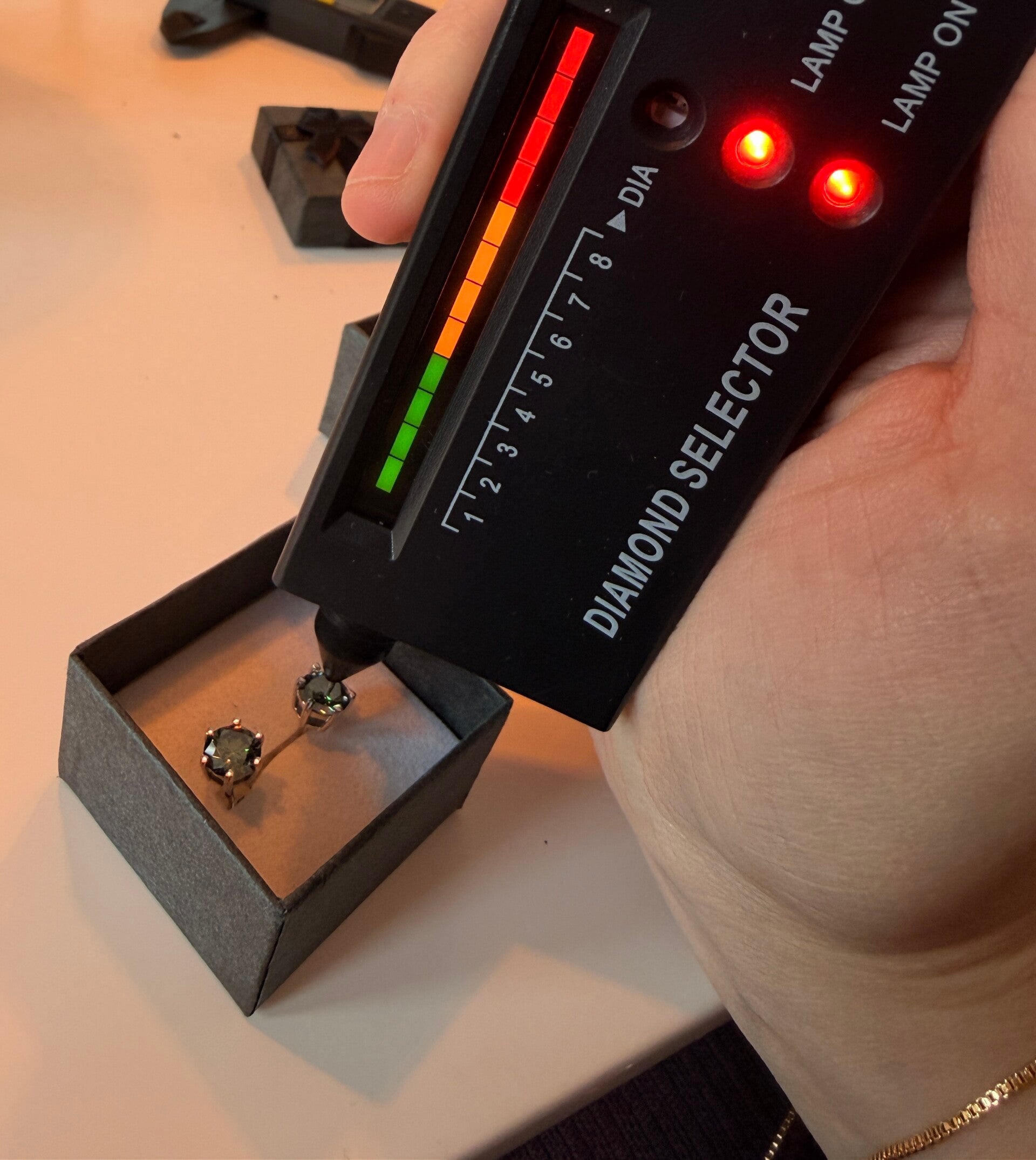 2 carat (1 carat hver) øredobber i S925. Øredobbene er grønn men man ser også litt blå tone i dem. Det følger ikke med sertifikat.