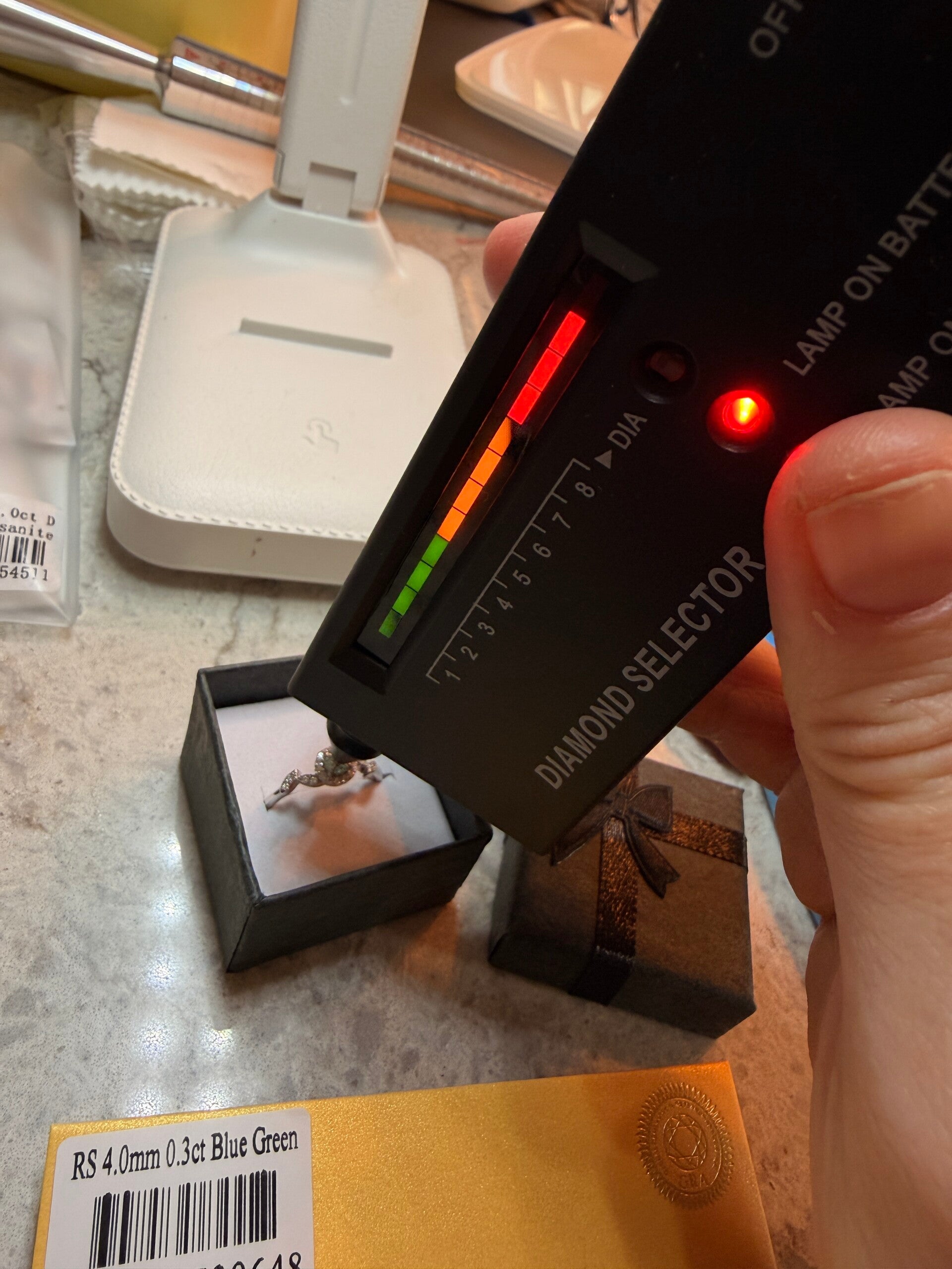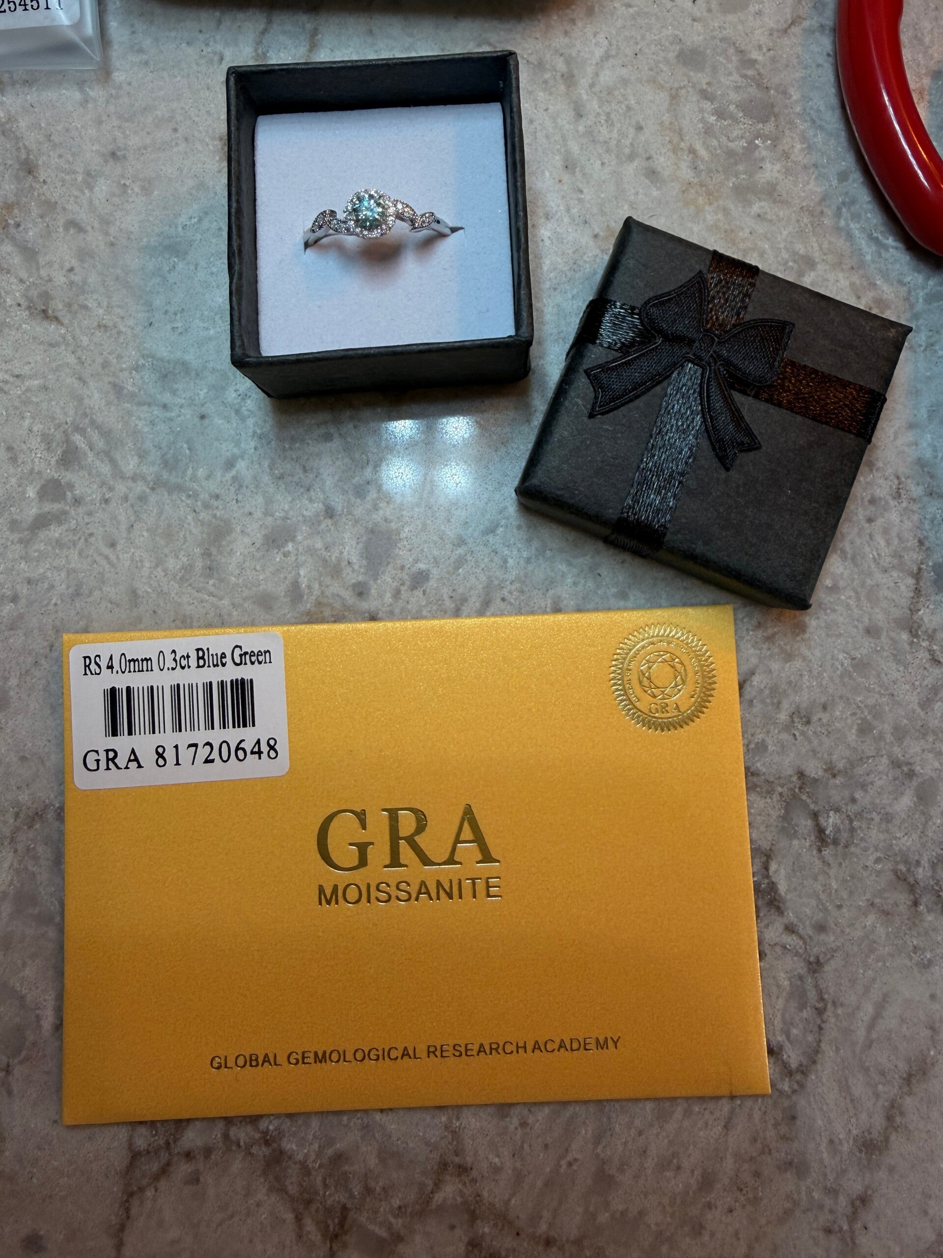 Blå-grønn Moissanite ring i S925 sølv og som er justerbar i størrelse. Moissanite steinen er 4mm, 0,3 carat, VVS1, round brilliant. Det følger sertifikat med.