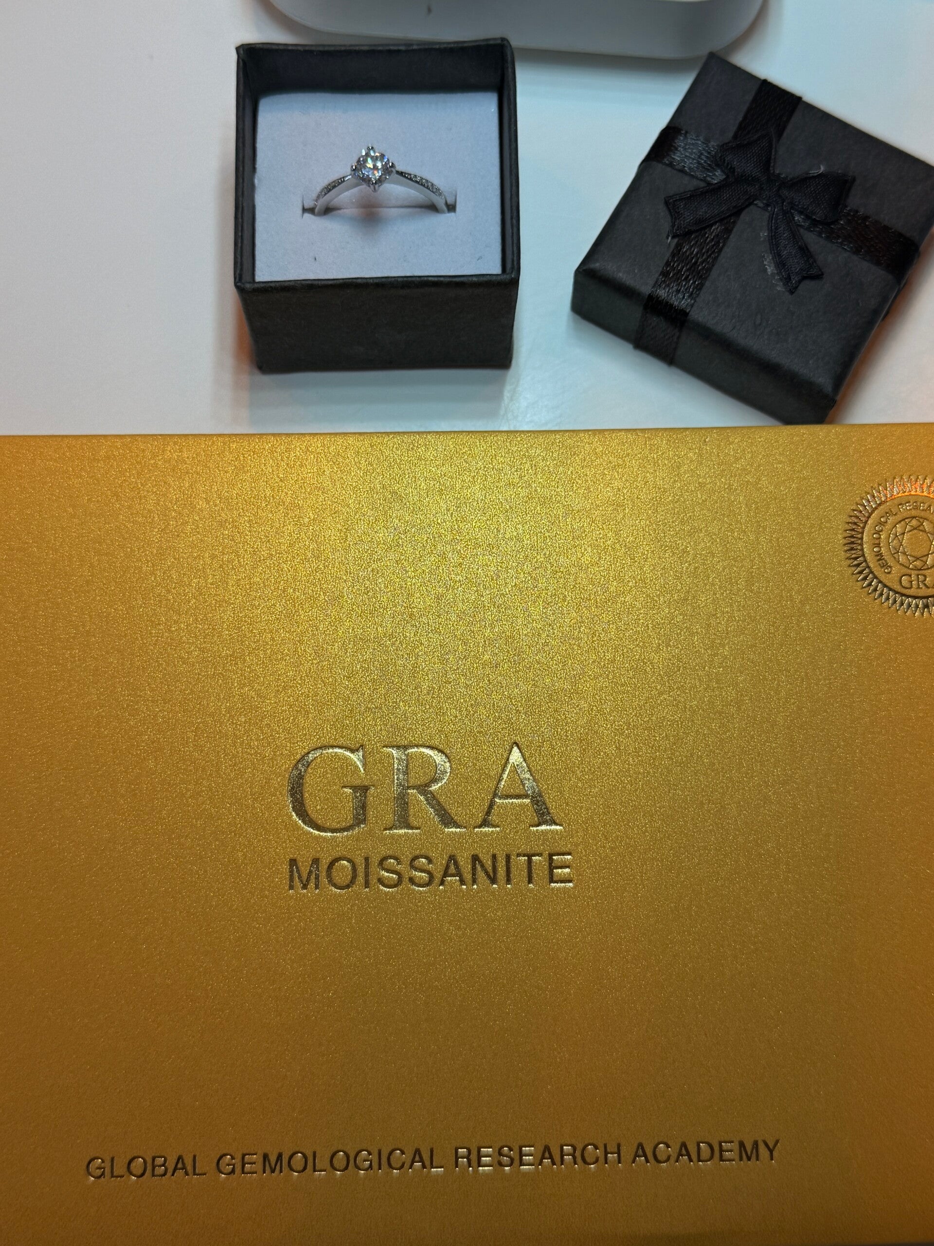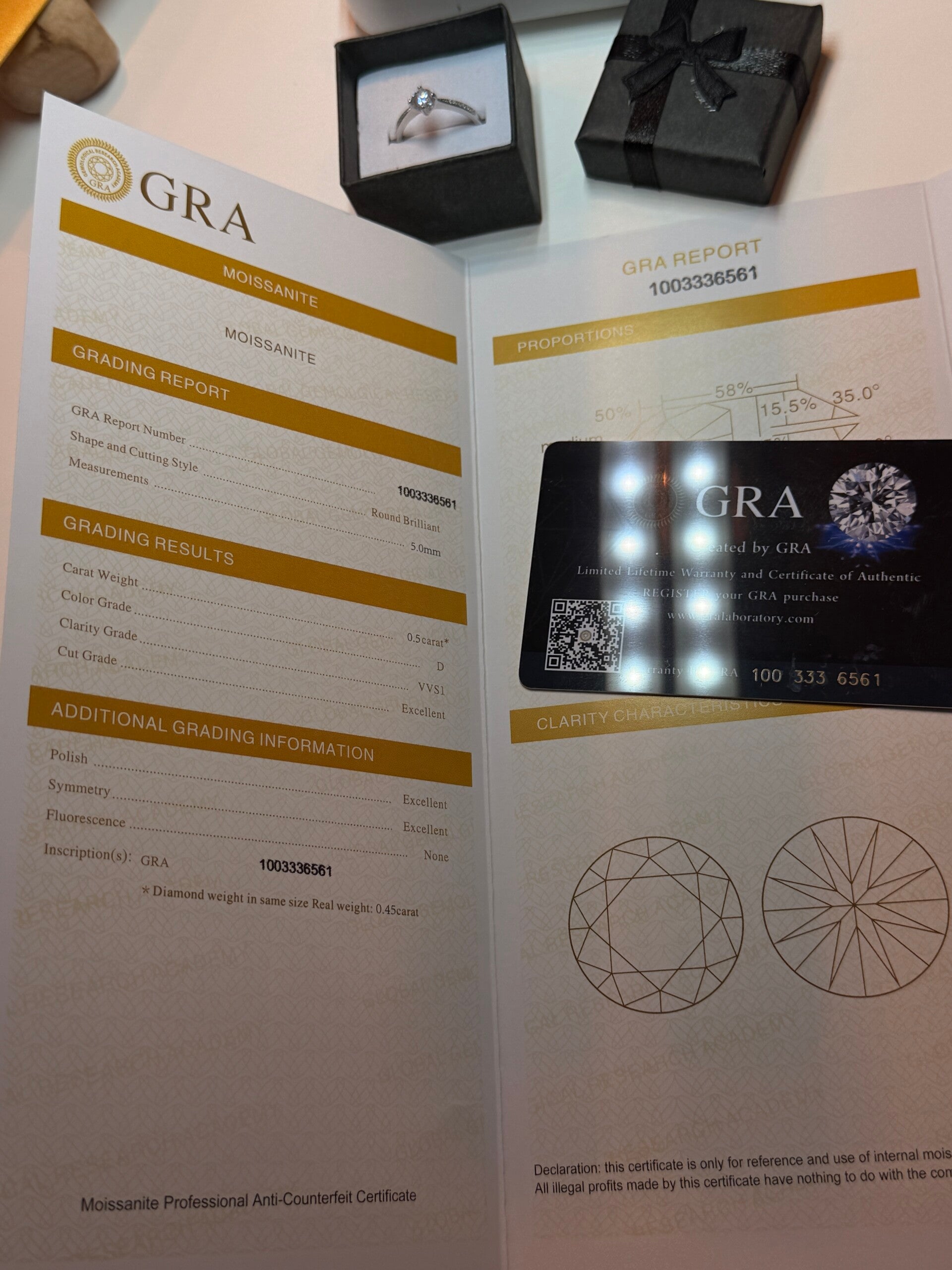 0,5 ct Moissanite ring i S925 som er justerbar i størrelsen. Moissanite steinen er 5mm, farge D, VVS1, round brilliant og excellent cut. Det følger GRA sertifikat med.