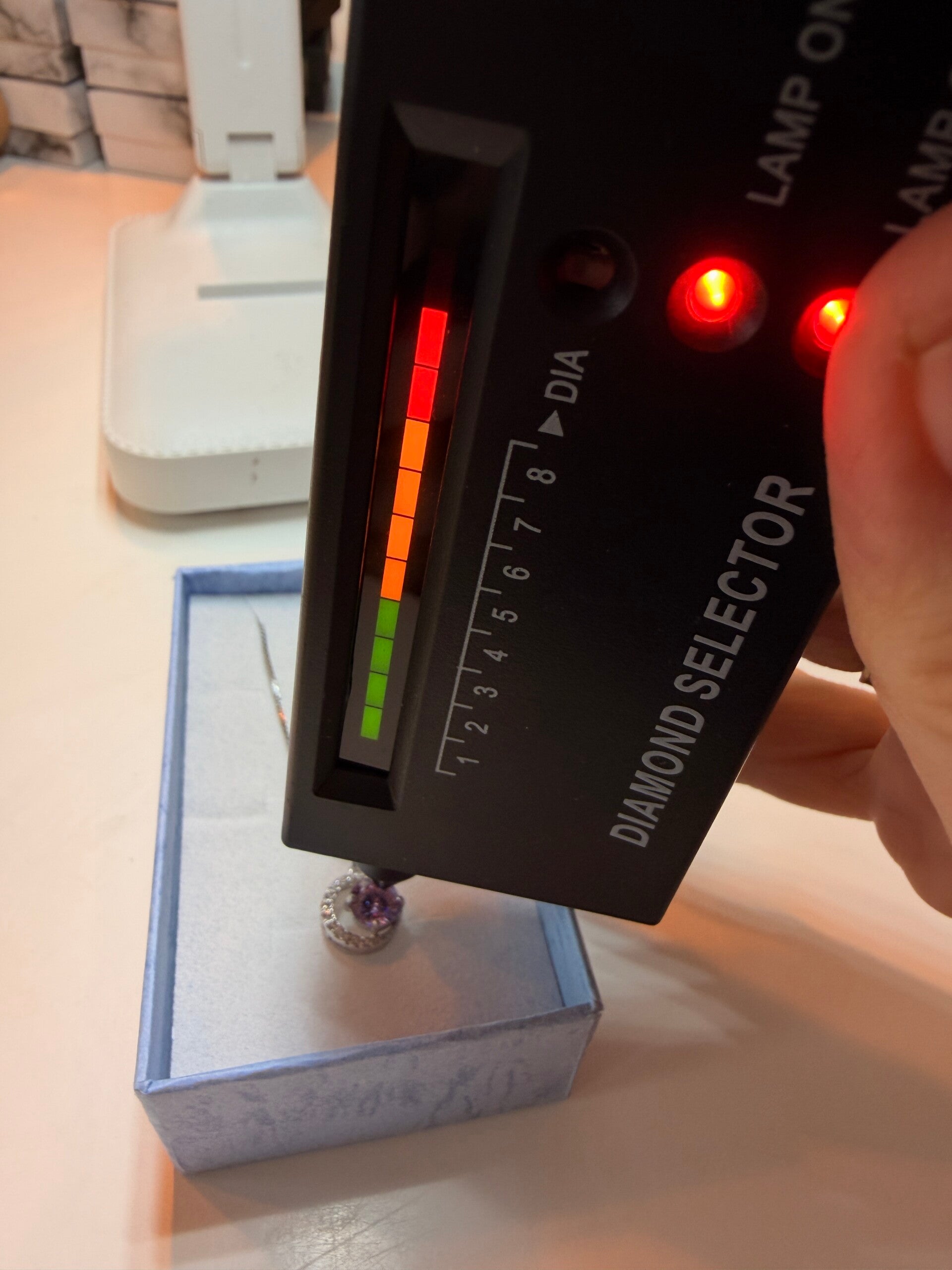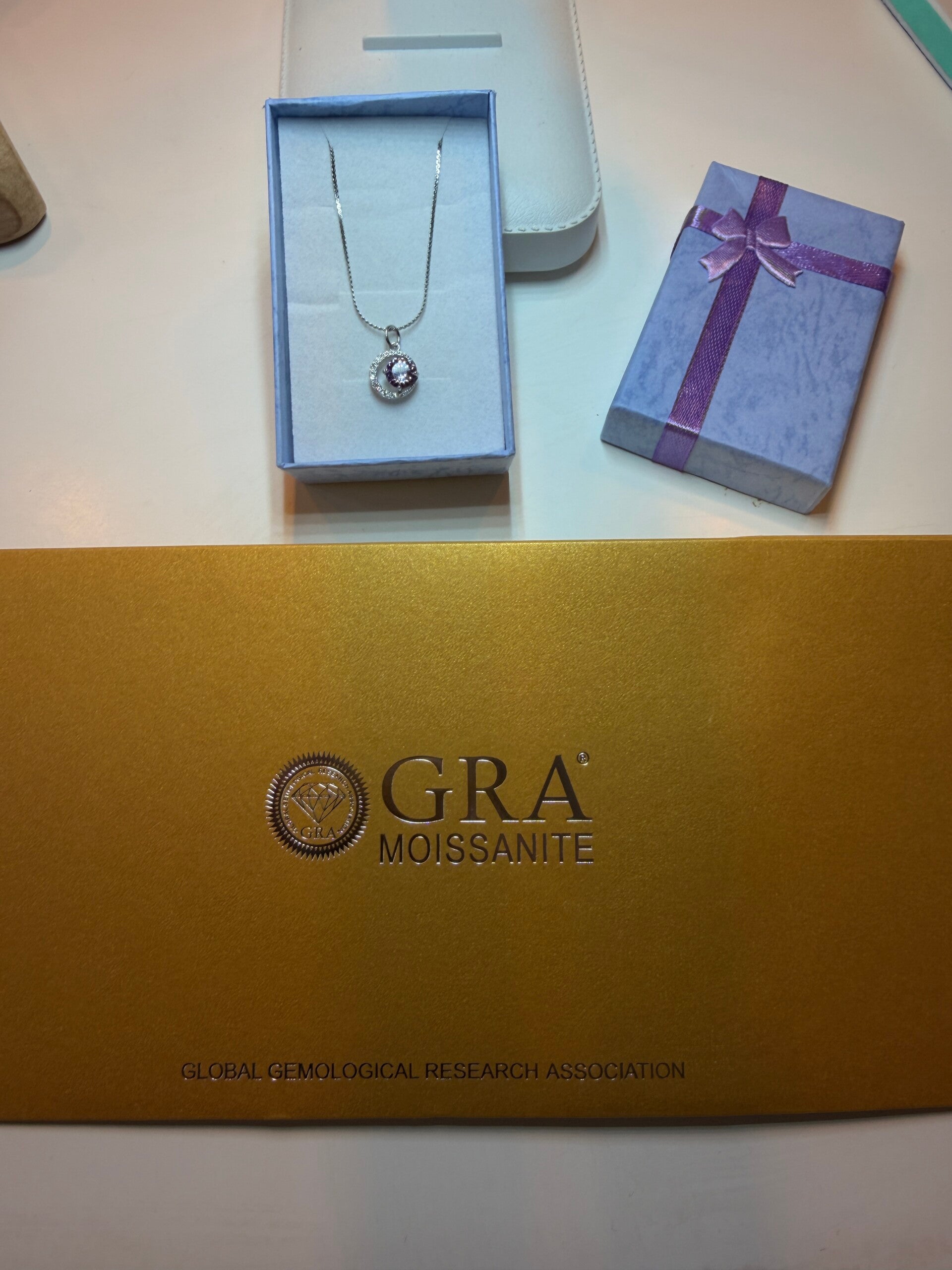 1 ct lilla farget Moissanite halskjede i S925. Moissanite steinen er 6,5mm, farge: light purple, VVS1, russisk cut. Det følger med GRA sertifikat.