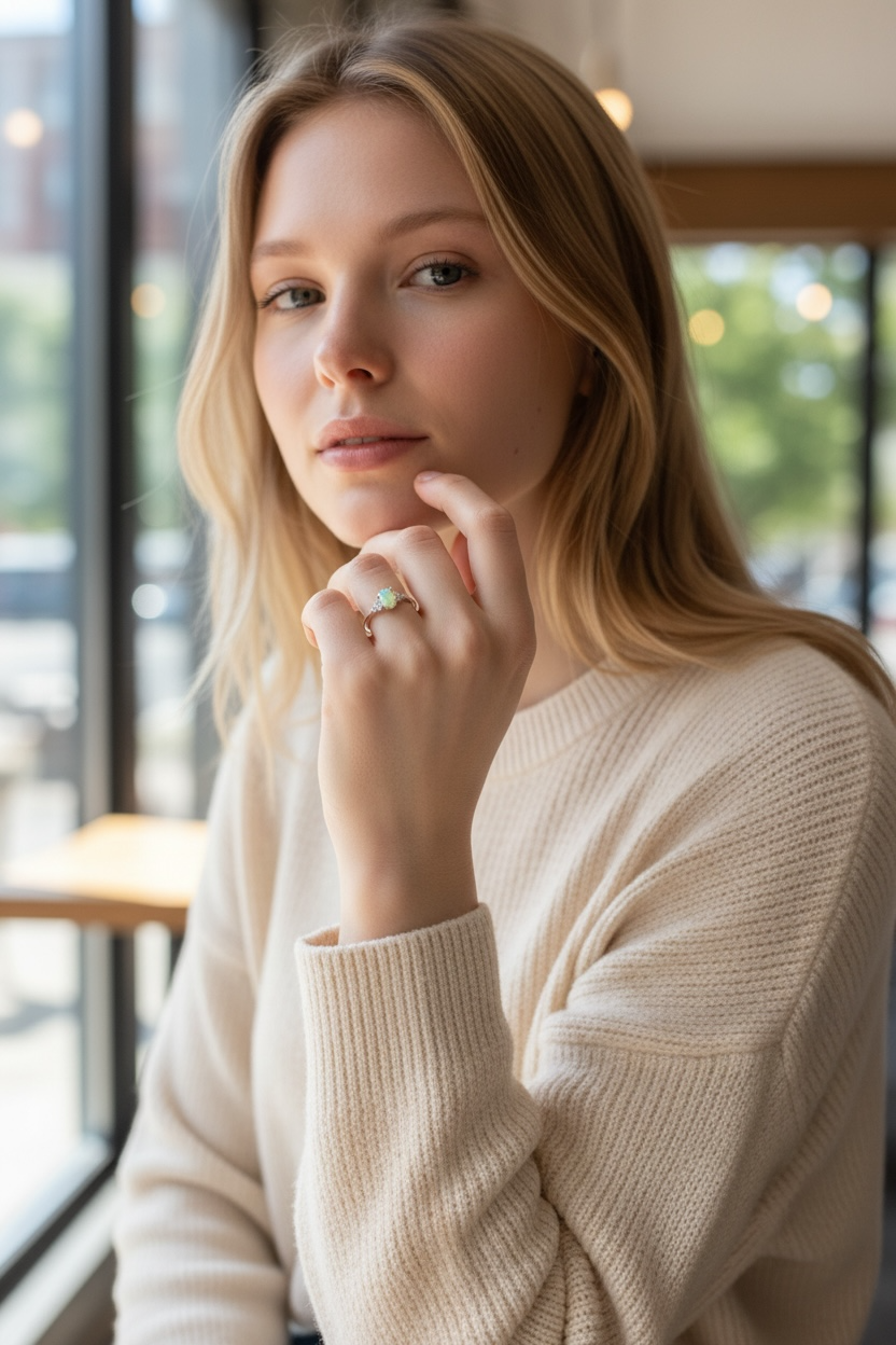 Vakker ring i S925 med en opal stein. Steinen er uekte men ser likevel veldig bra ut. Ringen er i str. 51 EU