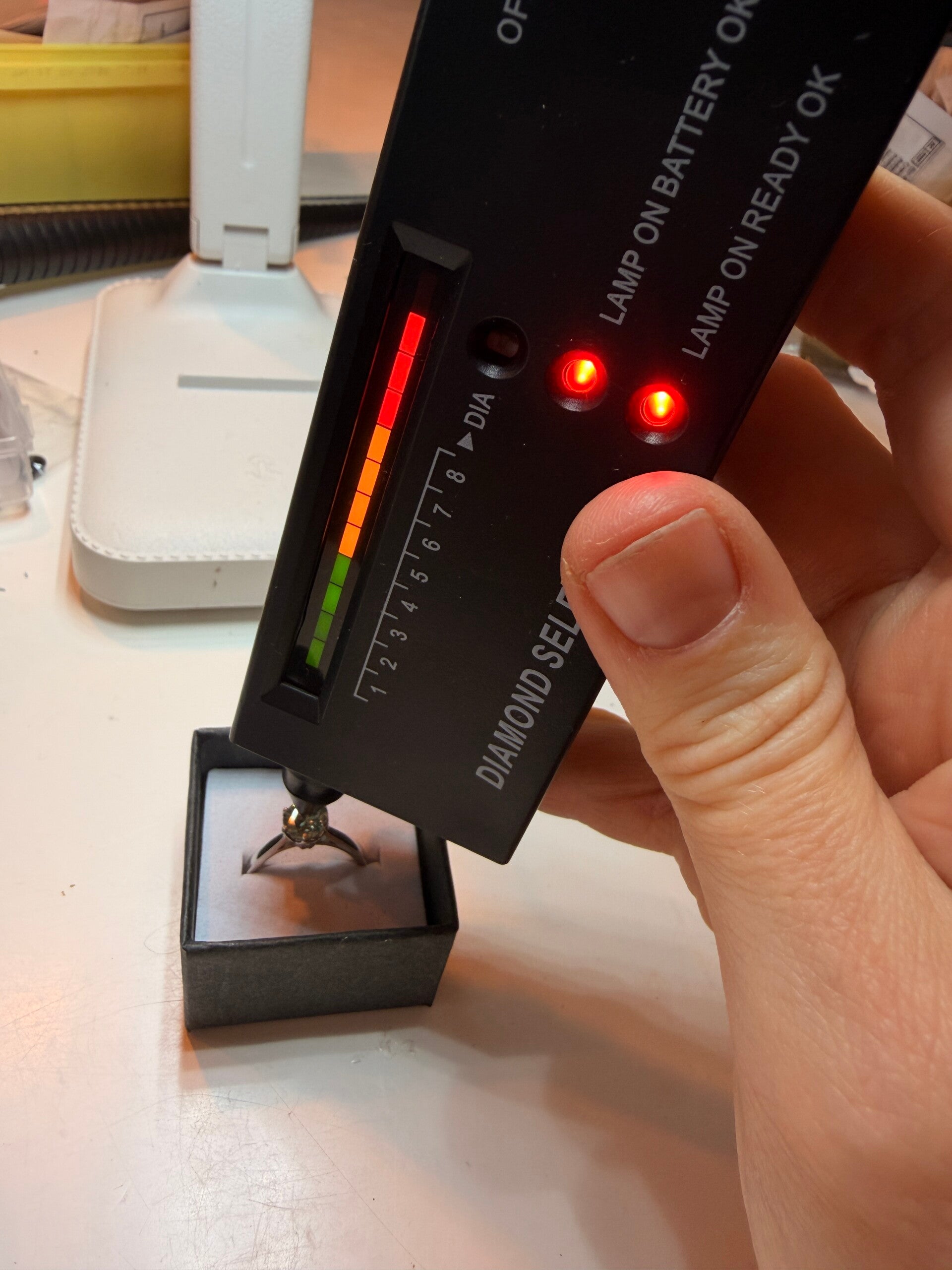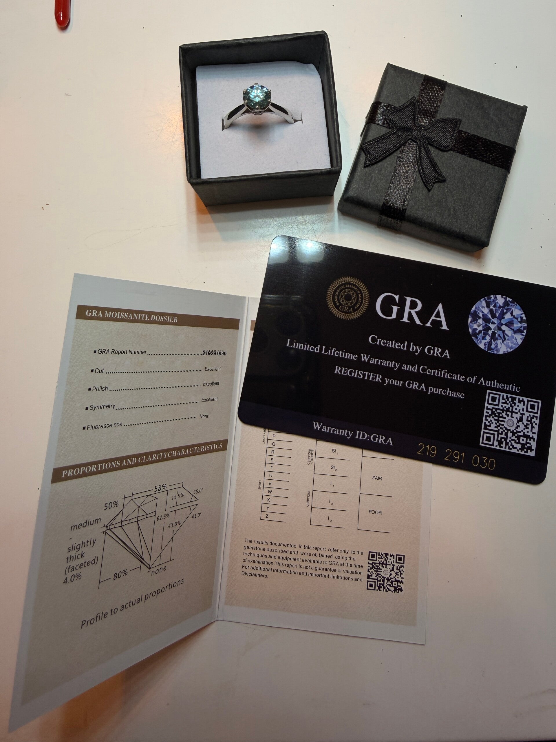 1 ct Moissanite ring i S925 sølv. Moissanite steinen er 6,5 mm, VVS1, round brilliant og blå/grønn farge. Det følger med GRA sertifikat.
