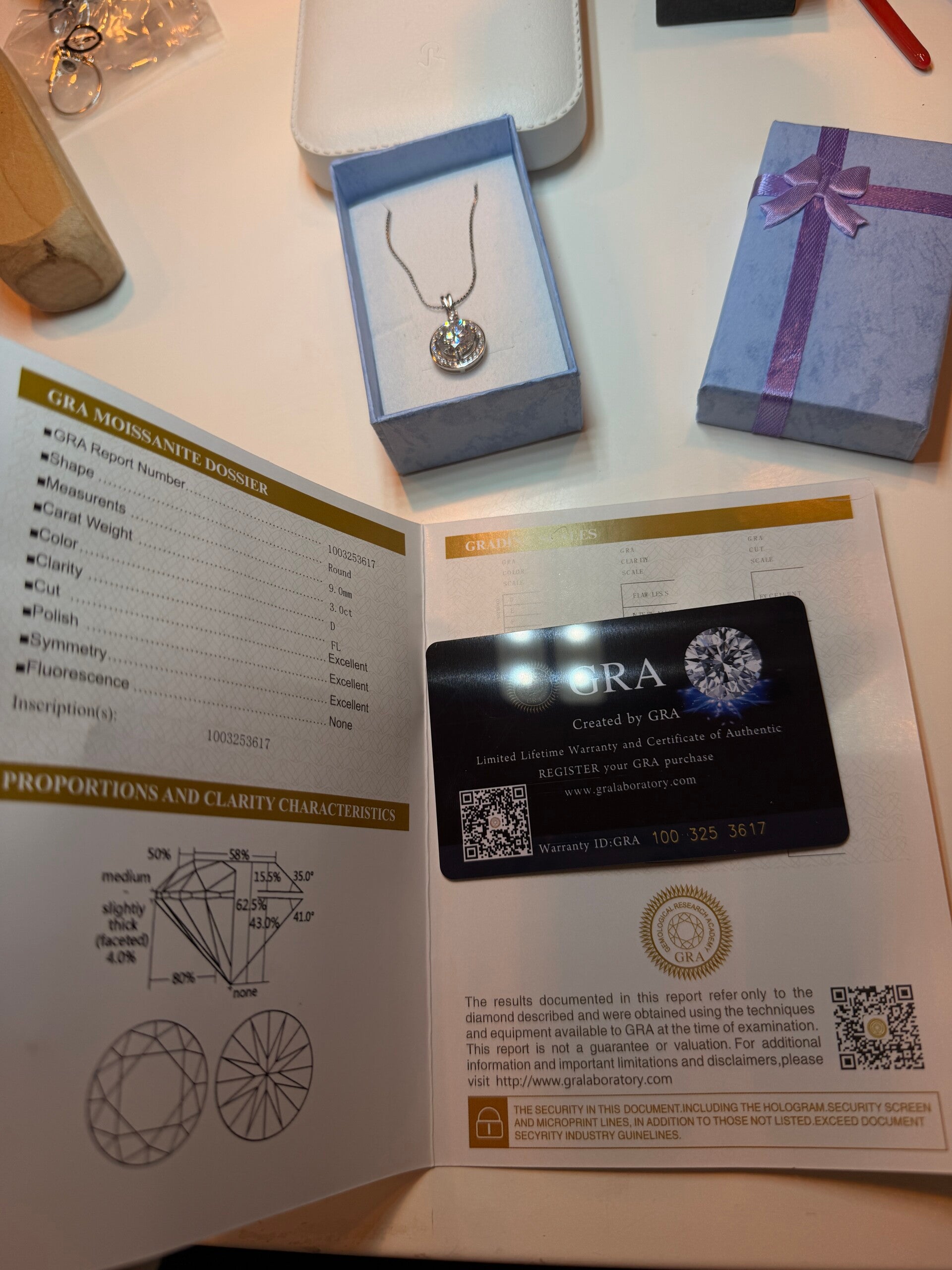 3 ct Moissanite halskjede. Moissanite steinen er 9mm, farge D, VVS1, round brilliant, excellent cut, clarity flawless. Smykket er S925 sølv og selve halskjeden er stainless steel. Det medfølger GRA sertifikat.