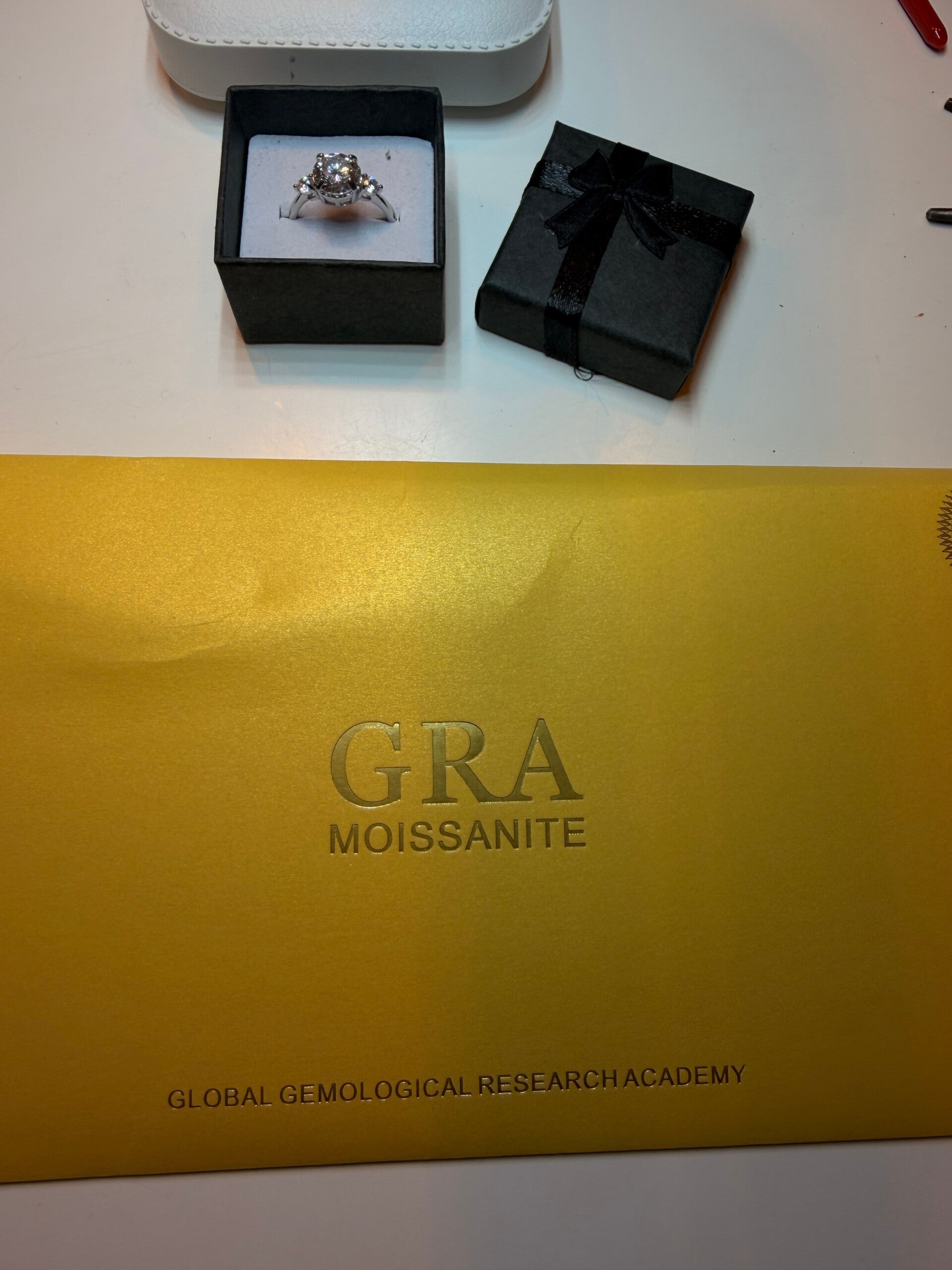 2 ct Moissanite ring i S925 sølv som er justerbar i størrelsen. Moissanite steinen er 8mm, farge D, VVS1, round brilliant og excellent cut. Det følger med GRA sertifikat.
