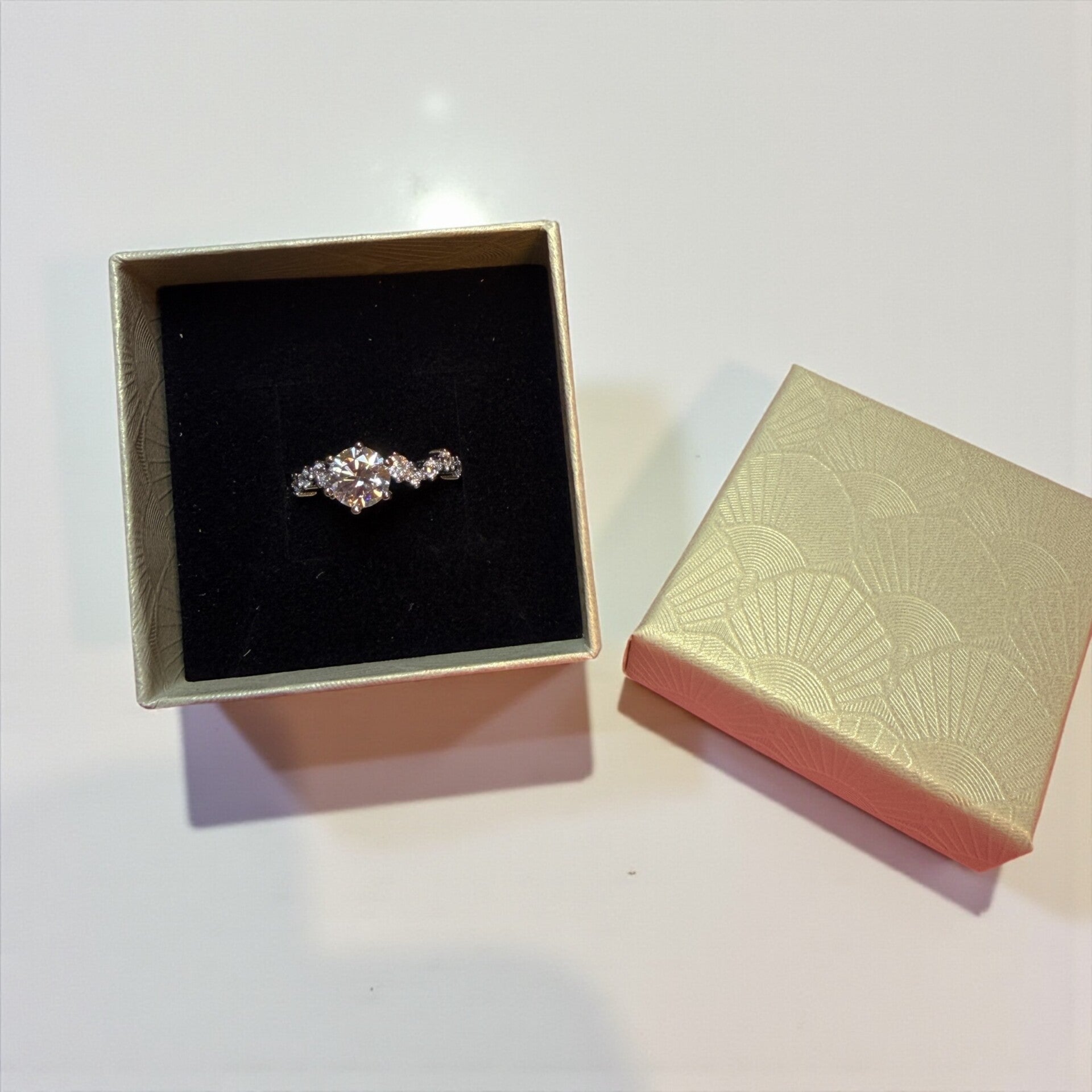 1 ct Moissanite S925 sølv ring. Moissanite steinen er 6,5mm, farge D, VVS1 og round brilliant. Ringen er i størrelse EU 49. Det følger GRA report med.