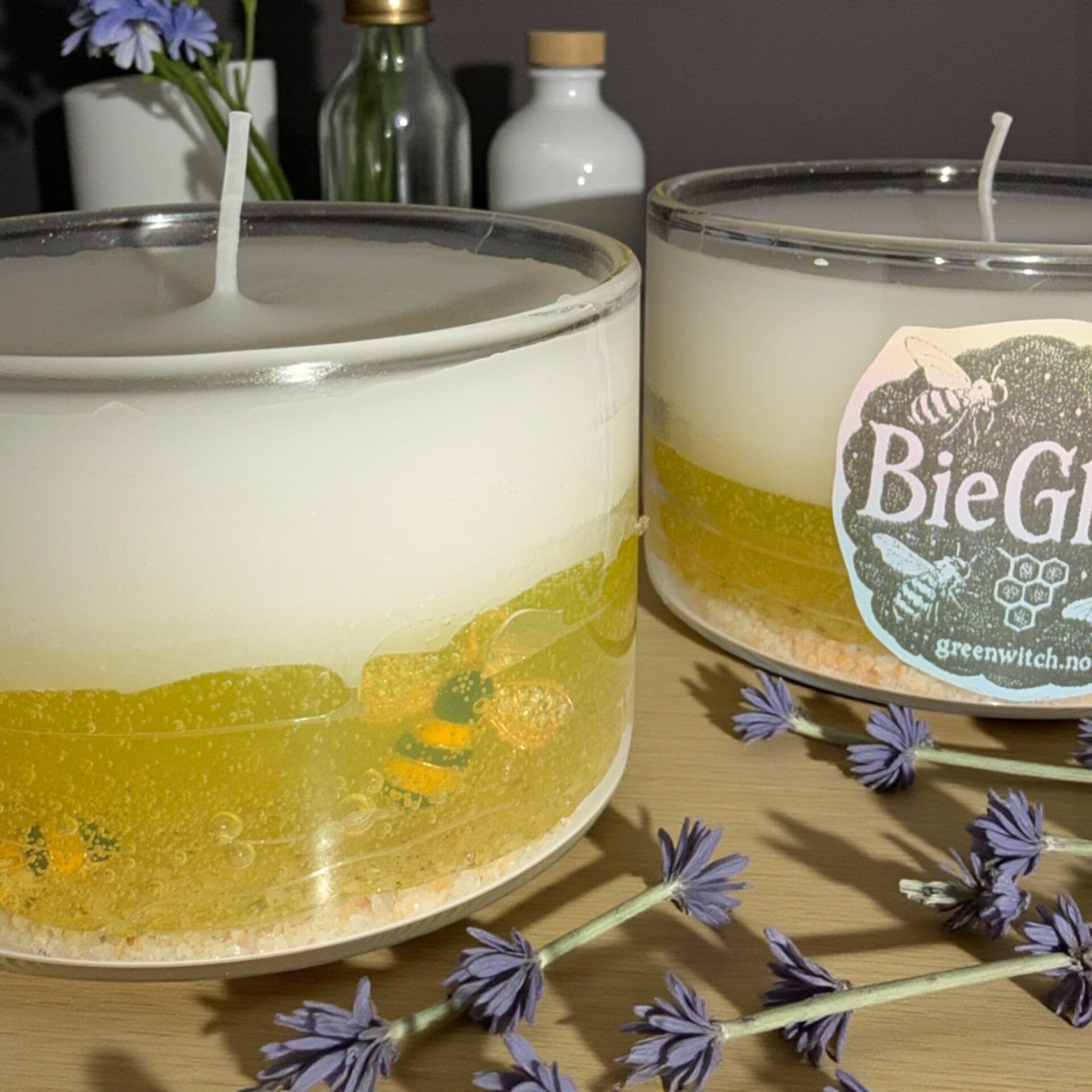 BieGlød lys er et lys som inneholder to bie anheng oppi gel voks og så øverst er det lyset selv som er hvitt, laget av bivoks og med honning lukt som er så deilig!