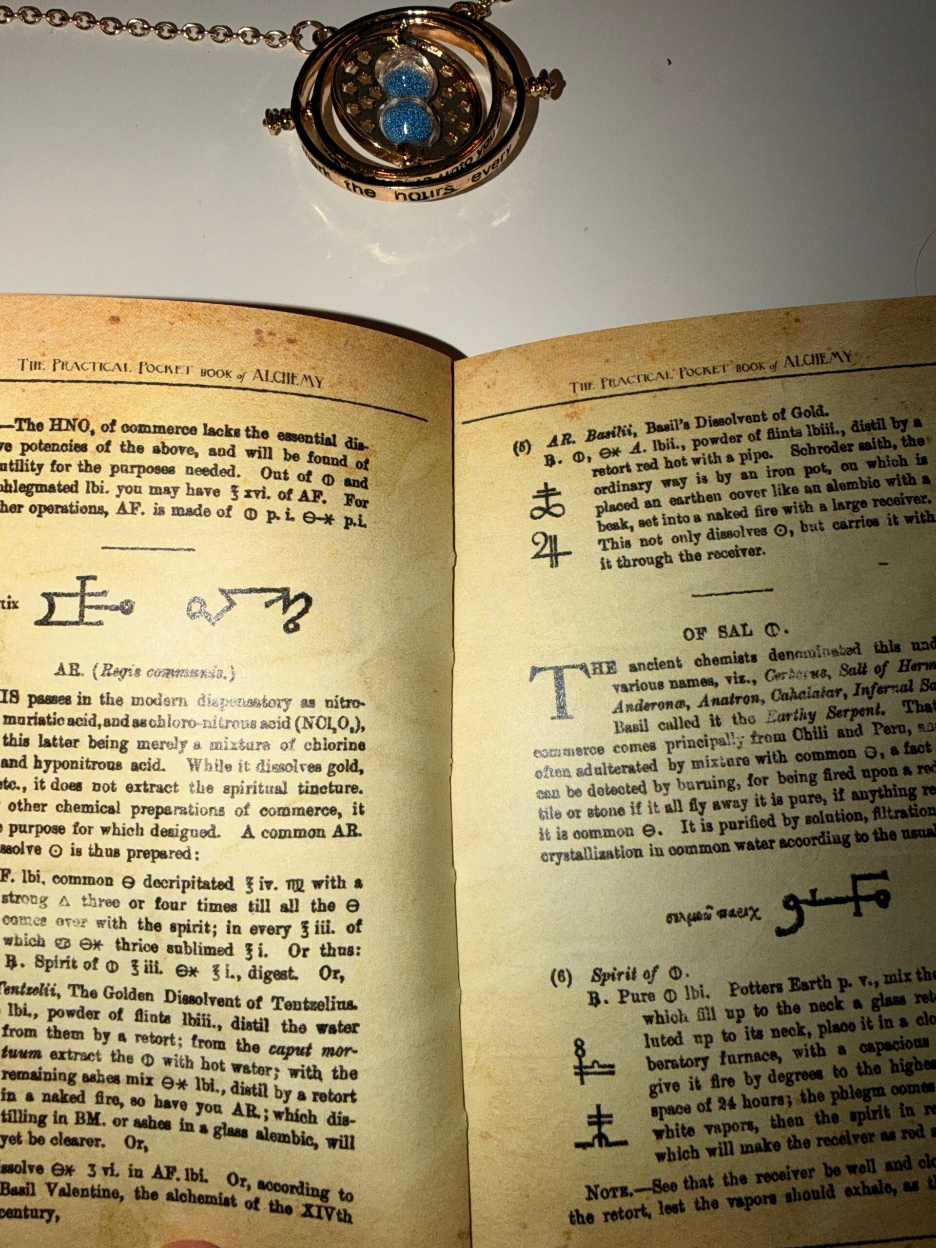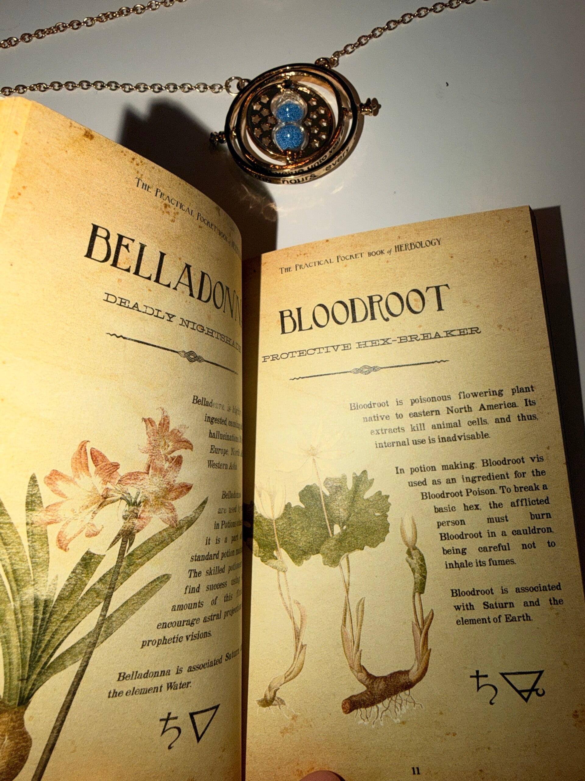Magiske bøker, 5 sammen med et pendant som har timeglass og timesvingere, bøkene er med illustrasjoner og tekst om alkymi, astrologi, magi, herbologi og chiromanti. Bøkene har dekorative omslag og inneholder symboler, diagrammer og forklaringer relatert til emnene. Disse er perfekt for Harry Potter fans og alle som er interessert i den magiske verden. Du får 1 pendant, farger på sanden i pendant er forskjellige men jeg trekker ett for deg og det er alltid gøy å ha litt overraskelse 🤫✨ Bøkene er i pocket størrelse 14x9 cm